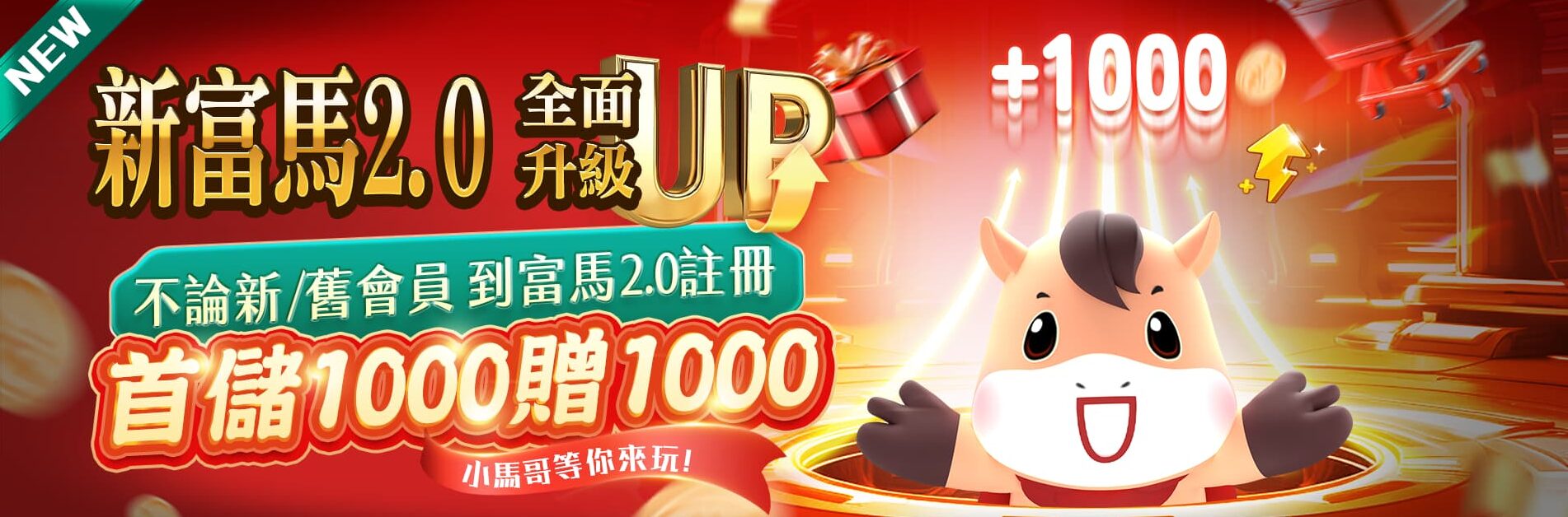 獨家富馬2.0會員優惠!當您成為FM富馬娛樂城的新會員並首次儲值達1000時,可額外贈送1000元彩金,名額有限,申請優惠請在遊戲前聯繫客服人員領取!